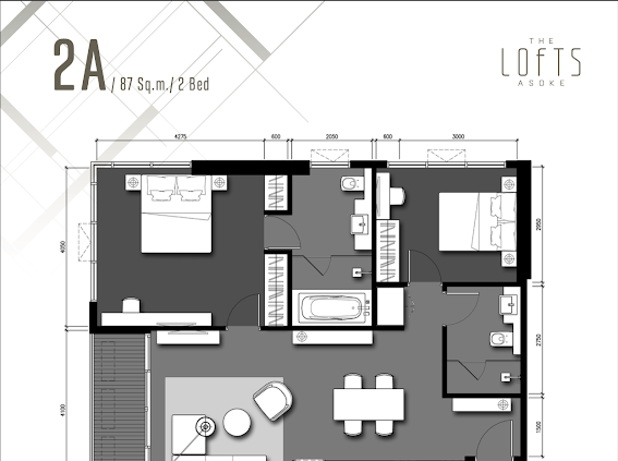 Lofts Asoke 9th floor, Type 2B Layout, quiet part of the building, 87 sqm., 2 bedrooms, 2 bathrooms (one bathub) , 75,000 THB. Feel free to advertise without asking.