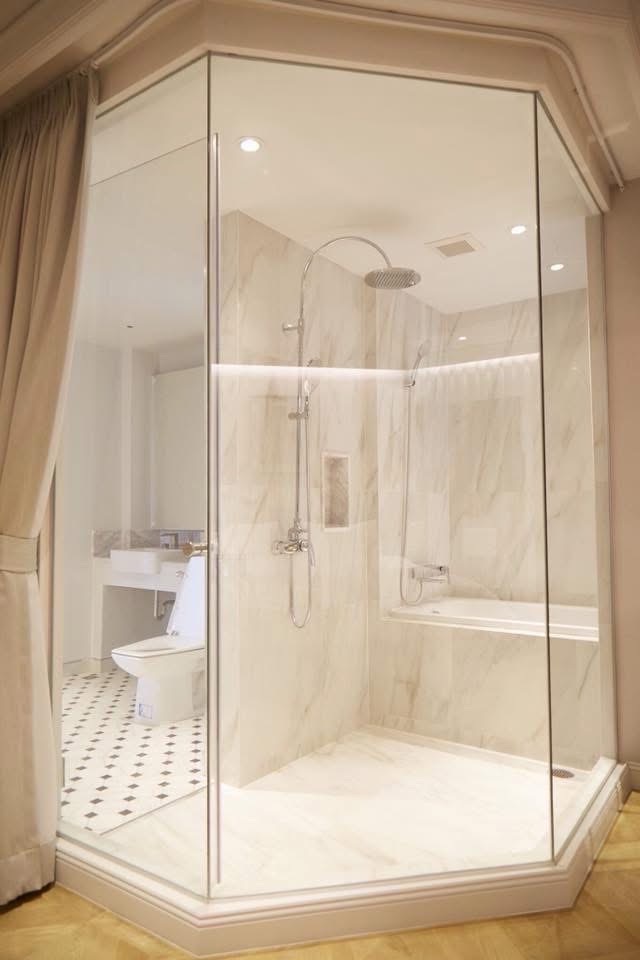 Generous walk-in closet and an oversized bathroom with a bathtub and glass partition for an airy, non-cramped feel.