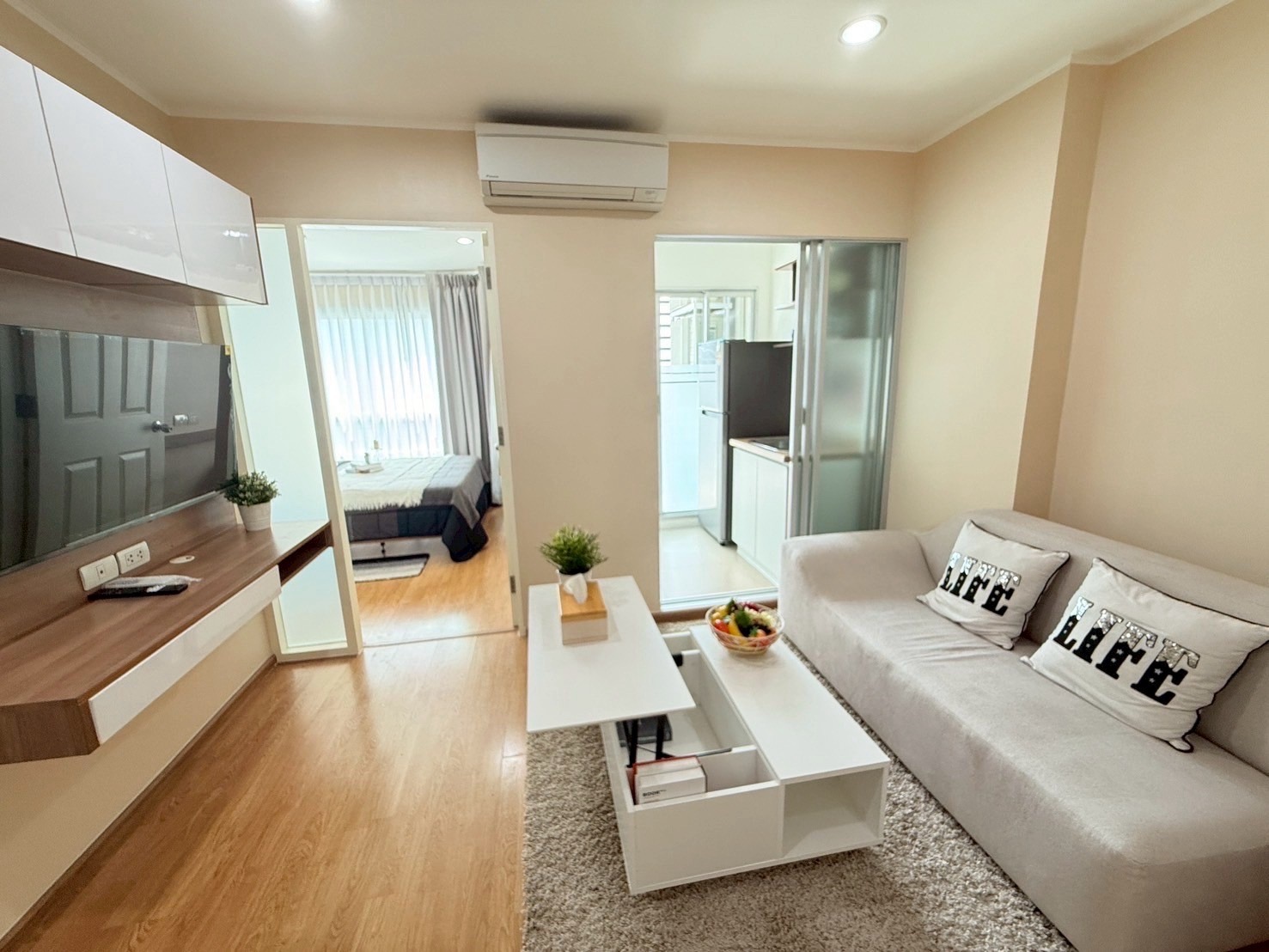 Electric appliances: Air conditioner, TV, refrigerator, stove, hood, water heater.